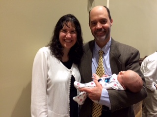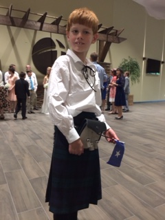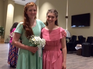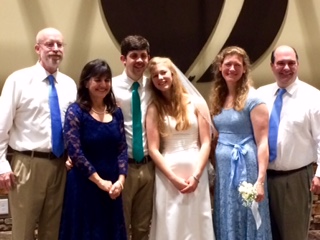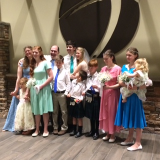 After lunch, we made our way up to David’s cabin for an open house. I played pool with Hope (age 15) and then with Schyuler (age 11?) and John (age 7?). We would not have won any billiards trophies, but at least we didn’t tear the felt! David and Hannah’s home is a wonderland for children. The cabin is utterly indestructible, with heart pine floors, ceilings and walls throughout and a huge stone fire place like those in the Grove Park Inn. A second story balcony runs the length of the house and all nine children sleep there on most clear nights from May through September, lined up in their sleeping bags. On other nights, the six girls share a huge girls dorm room and the three boys share a big room down the hall. There are at least three or four other bedrooms, but they enjoy being together. (I know you don’t believe this, but I have known these folks forever, and have never once heard an unkind word or grumble among them.) The walls of the cabin are full of family portraits, photos and artwork, spanning four generations of Glovers. Hangers and Kennedys. A grand piano, a large red hammock, and a map of the US strung with colored string and pins to map the family’s annual RV excursions share the living room, along with an assortment of well-loved furniture, books and games. I don’t recall seeing a TV. What a life! I was having such fun, I forgot to take pictures for the blog! Below is a picture from the wedding of all 11.5 of the David Kennedys, plus Andrew, the recently acquired son-in-law. (Clarke, Marcia and Bo are shown in the April 21 post.)