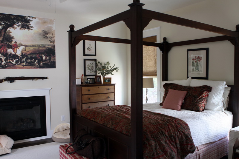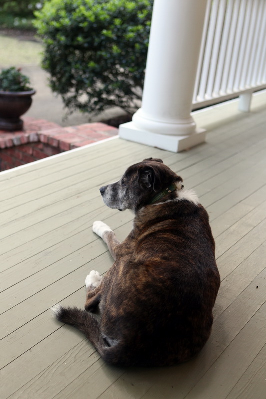 April 26, 2015. Yesterday we chowed down on a real farm breakfast of eggs (homemade), bacon (not homemade), fresh fruit and strong coffee. Thus fortified, Matt and Christopher set out for a state-wide music contest in which Christopher played the trombone, and the rest of us visited a nearby farm in Ashland VA where Alyson’s draft horse, Blossom, presides over her own lush pasture. Blossom is a huge tri-color mare who is mostly white but with patches of brown on her chest and sides and a black mane — a very sweet, gentle companion and good in the hunt. After lunch Alyson and I played some fierce Canasta, with Madelyn cheering us on. We took a late afternoon hike through the beautiful woods surrounding the house — almost exclusively mature hardwoods bristling with bright green new leaves. We especially like the smooth-bark American beeches, which grow so big in this area. Matt grilled steaks while we all gathered in the kitchen to cook the other fixings — a perfect dinner for the big farm table overlooking the porch. We stayed up late again, this time all playing a fun game called Things, which I lost miserably. Alyson, Madelyn and Christopher were so funny doing impressions — my sides still hurt from laughing so hard for so long.