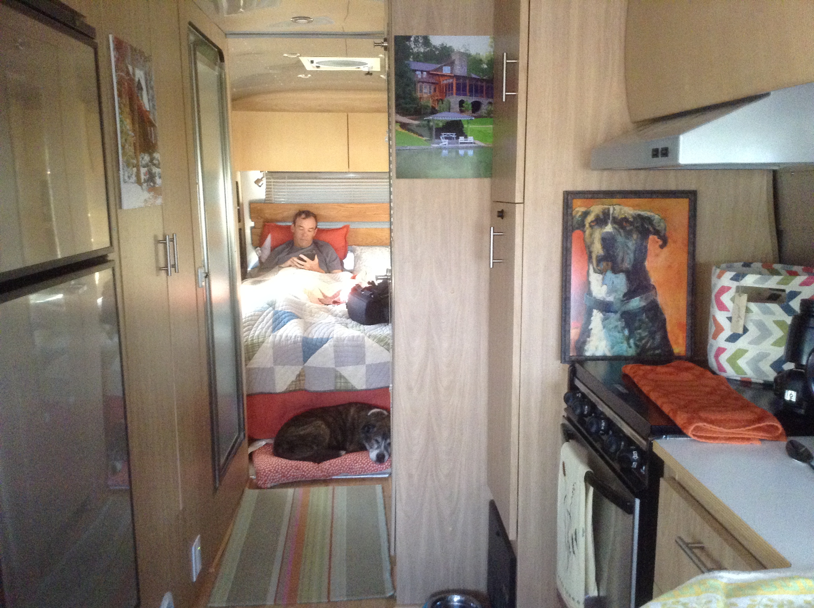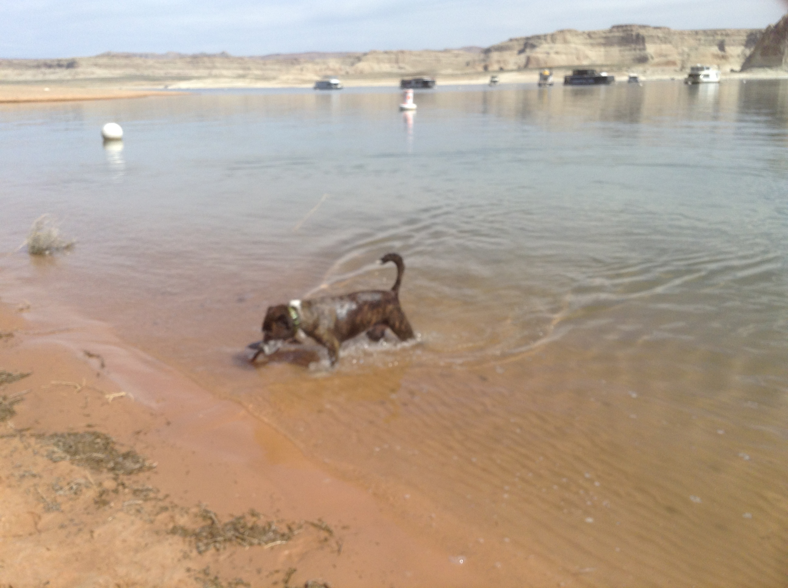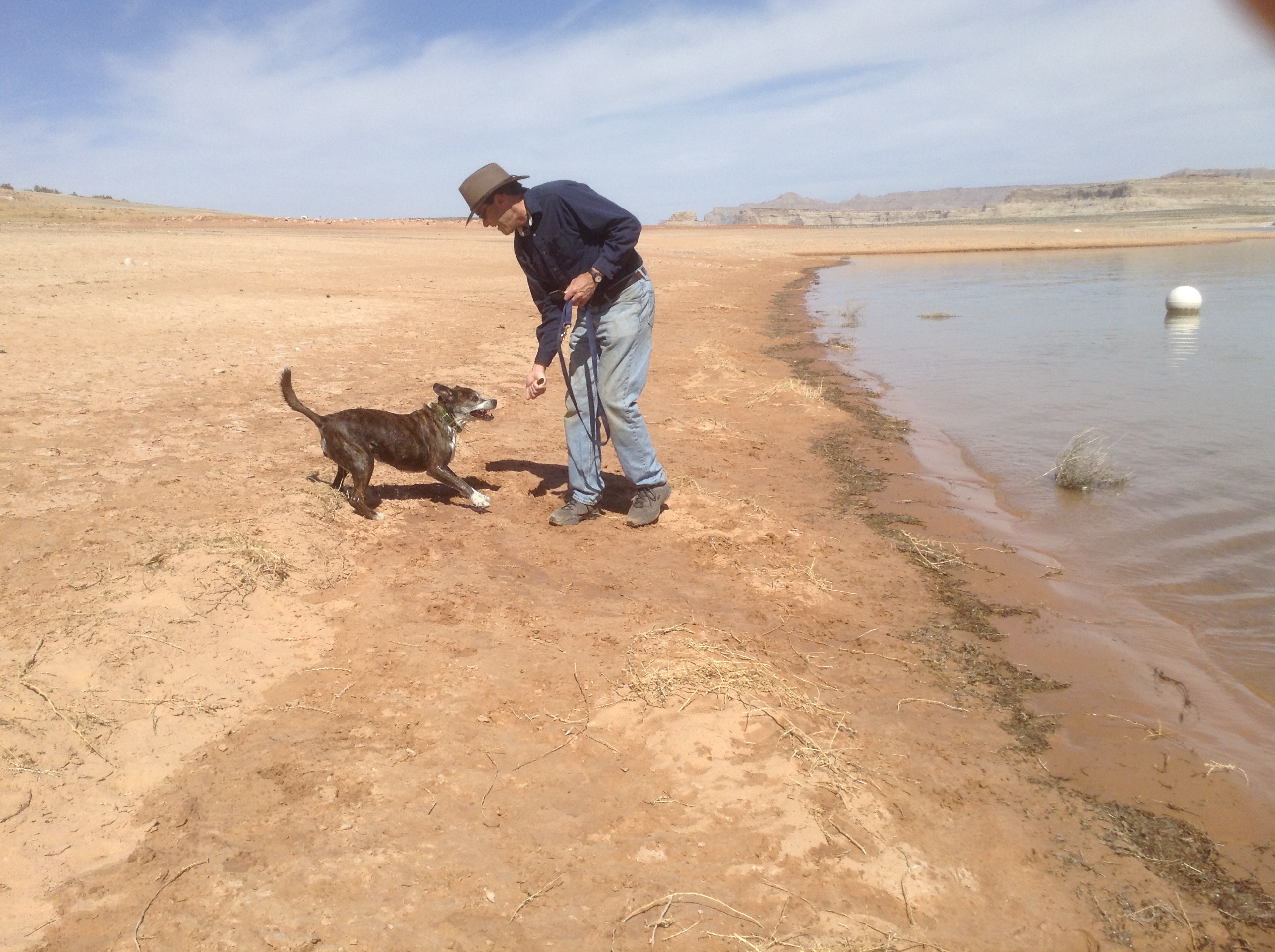 In the meantime, we took Doris for a walk to the shore of Lake Powell. It was the highlight of the trip for her so far. She had quite a frolic chasing a stick into the cool waters and getting rinsed off in her personal outdoor shower. It’s Miller time.