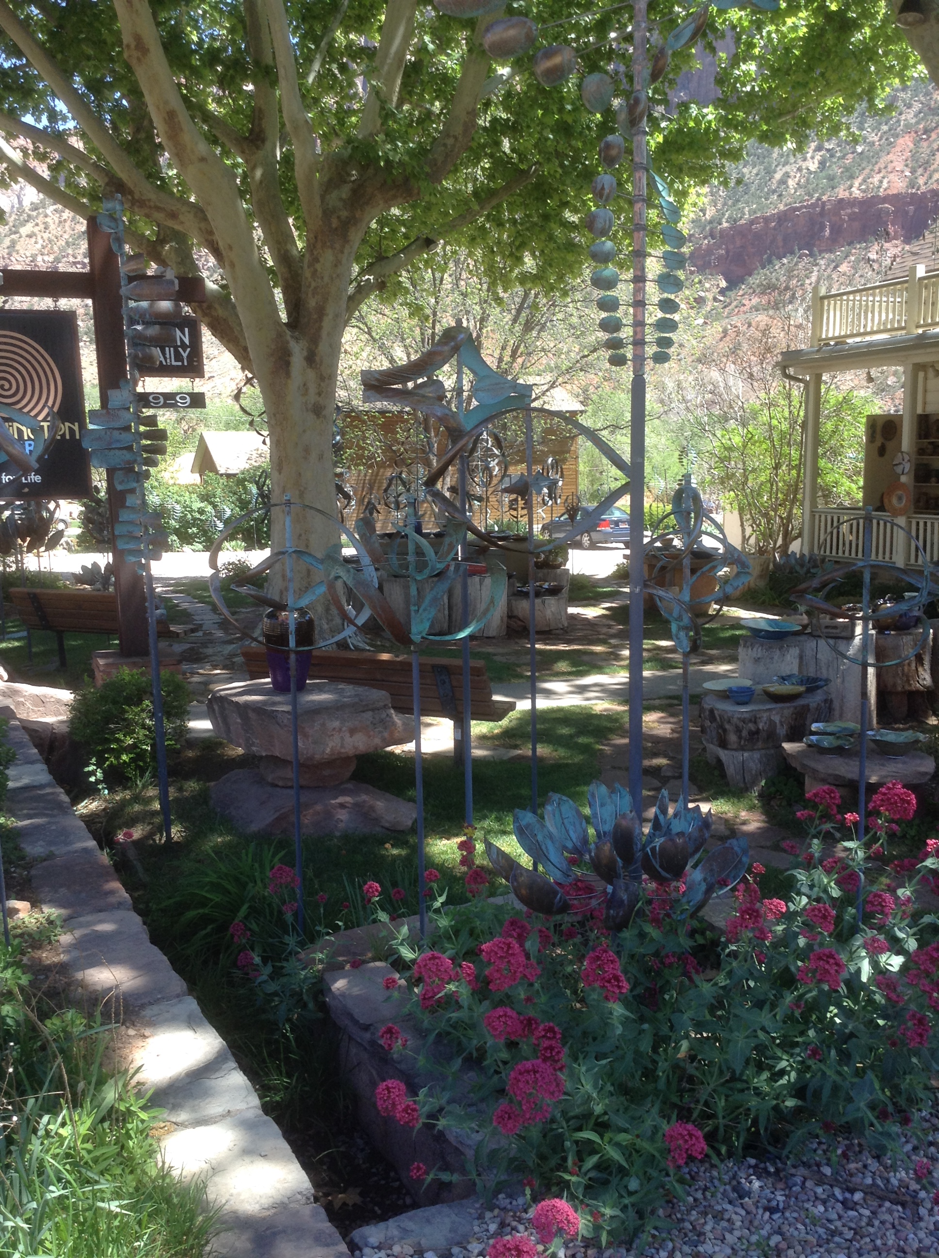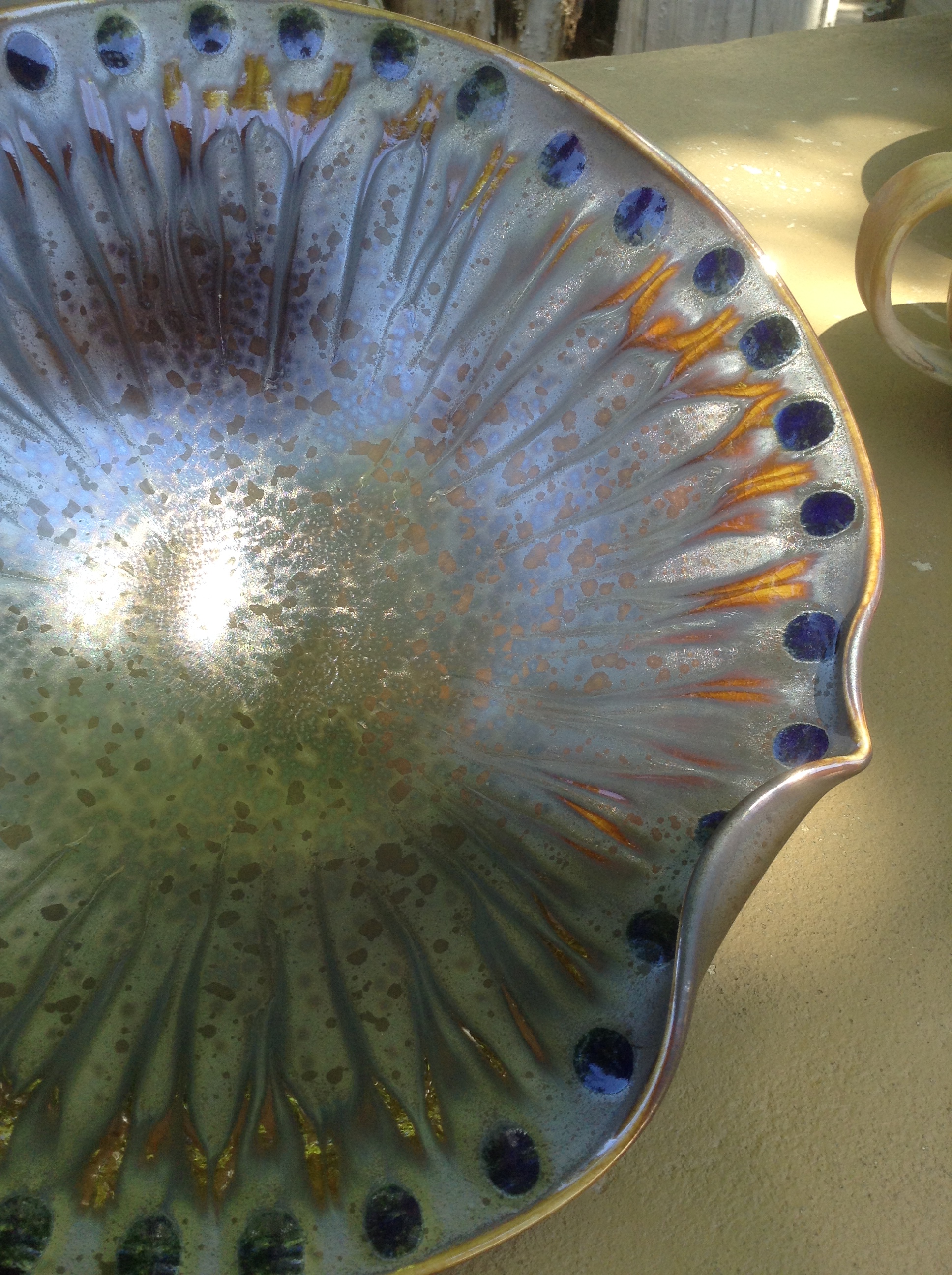 We stopped in Cortez to buy groceries and gas — on the map it looked like the last chance for at least 300 miles. Thus fortified, we set out across an unbelievably vast expanse of Indian Nations, first Ute then Apache and Navajo and probably some others that I didn’t realize we were in. Not long into the journey west, we came to Four Corners Monument, a remote oasis (of a commercial sort) in the desert, where one can stand simultaneously in Utah, New Mexico, Colorado and Arizona. It was a pleasure for us to pay the $5 per person admission, as the Native American population here has such a limited opportunity for commerce. In fact, I don’t see how in the world they make any headway given the land they have been relegated. It is like the surface of the moon — rocky, sandy, and dry as a bone. We passed dry “rivers” identified as such only by the name on the sign — no water in sight. Around the four corners monument are about 50 booths set up with Native American crafts for sale. We saw wonderful examples of horse hair pottery, sand painting, silver and stone jewelery and something I had never seen before — pottery vessels decorated with meticulous images and scenes using needles. I wanted to buy something at every booth, but that was of course impractical. I settled for one turquoise necklace, two pairs of earrings and a bracelet. The “needle vase” I had my eye on was $250, so I just admired the hell out of it and moved on. One thing interesting: they had a sign at the entrance saying don’t even think about scattering human remains here; they find that extremely offensive. Dang! I always carry around an urn or two to scatter at places I like — like a dog leaving a liquid message to indicate his recent visit.