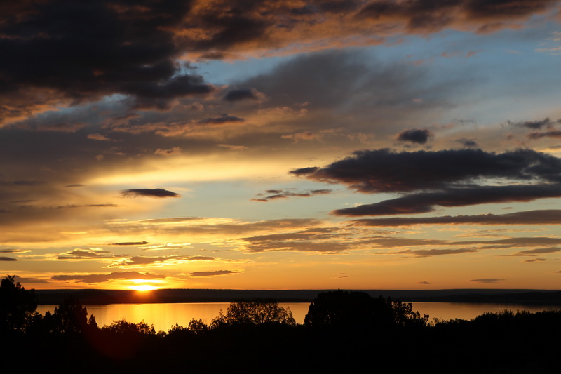 Our campsite here is stunning — according to the park ranger, it is the most coveted spot of all and is booked solid for the next four months (Site 051 on Buffalo Grove — book early if you are coming this way!). It looks out on a Cochiti Lake, in a high desert environment. The dominant vegetation is scrubland, but it has a beauty that is unique. Low dark green bushes grow in random clumps but seem almost intentionally placed, like polka dots on dotted swiss. When we arrived at about 2 pm, the sun was blasting but the temperature was only 80 with a strong wind. It rained for about two seconds — the drops evaporated as soon as they hit the ground. I made Brad play a game of Canasta with me — we disguised our G&Ts in Turvis tumblers and sat inside with visions of impending doom in the backs of our minds the whole time. But no-one came to smell our breath, so we are good to go. Jenny — you won’t believe this, but the game was neck and neck until the last hand in which I got 4 red threes, 2 red canastas, and 1 black canasta! I am red hot!